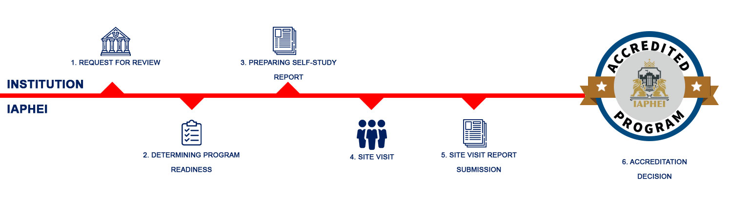 Initial programmatic accreditation starts by sending a Letter of Interest signed by the Head of the Institution along with the eligibility application obtained from IAPHEI from which IAPHEI will determine the applicant is eligible and falls within the scope of the accreditation. After receiving the eligibility, an agreement should be signed and the institution should do a Self-Evaluation Study about the Institution. The Self-Evaluation template can be obtained by contacting IAPHEI.